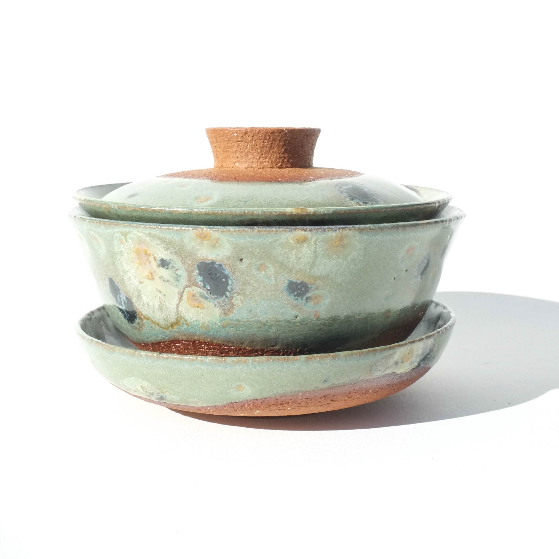 Beautifully thin and light for stoneware! Holds a lot of tea without being a chonk. Green speckled glaze with exposed raw clay on the outsides of the pieces. Cup is lined with white that will crackle with use so you can see the color of your tea!