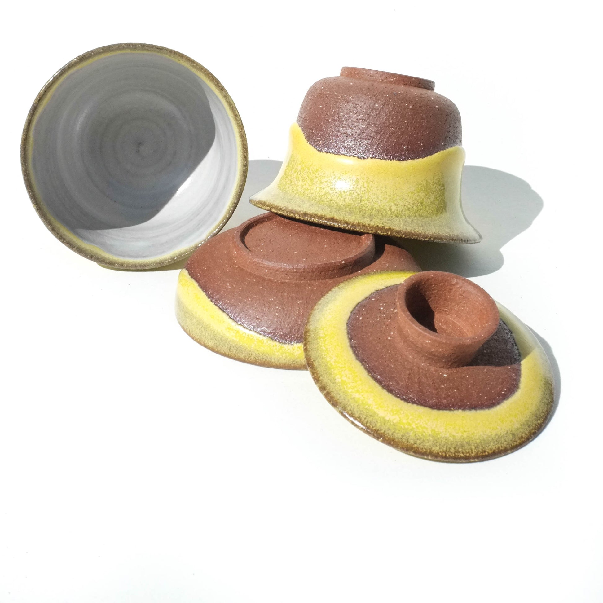 Been having a lot of fun with these taller gaiwan forms. Also loving this very autumnal yellow glaze. Cup is lined with white (it will crackle with use) so you can see the color of your tea! Exposed red clay on the outside. All tea-brewing surfaces are glazed.