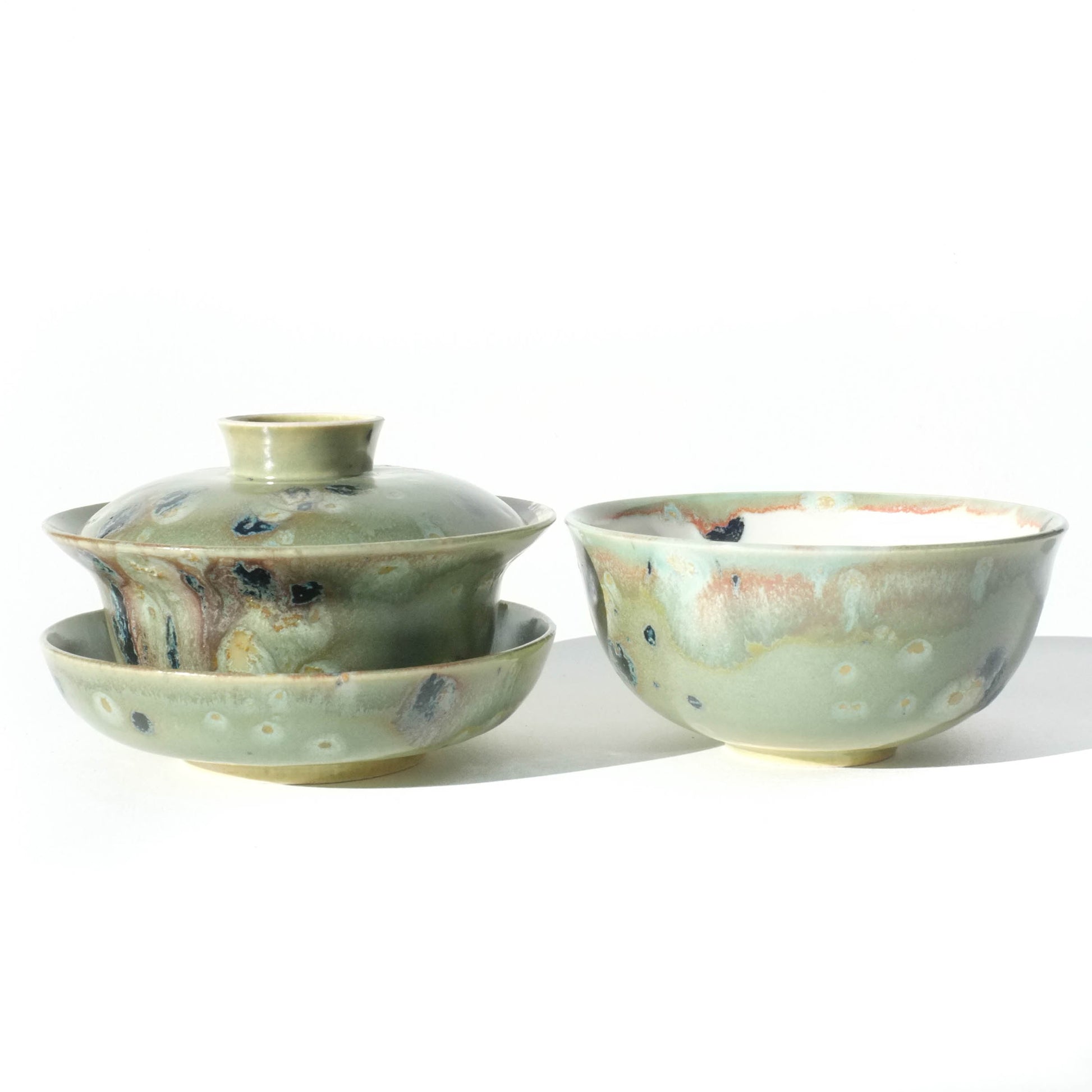 Holds a lot of tea without being a chonk. Holds a hair over 150ml. This glaze is pretty wild! Lots going on. Gaiwan pours nicely, and the cup has plenty of room for the generous steep. Cup is lined with white that will crackle with use so you can see the color of your tea!