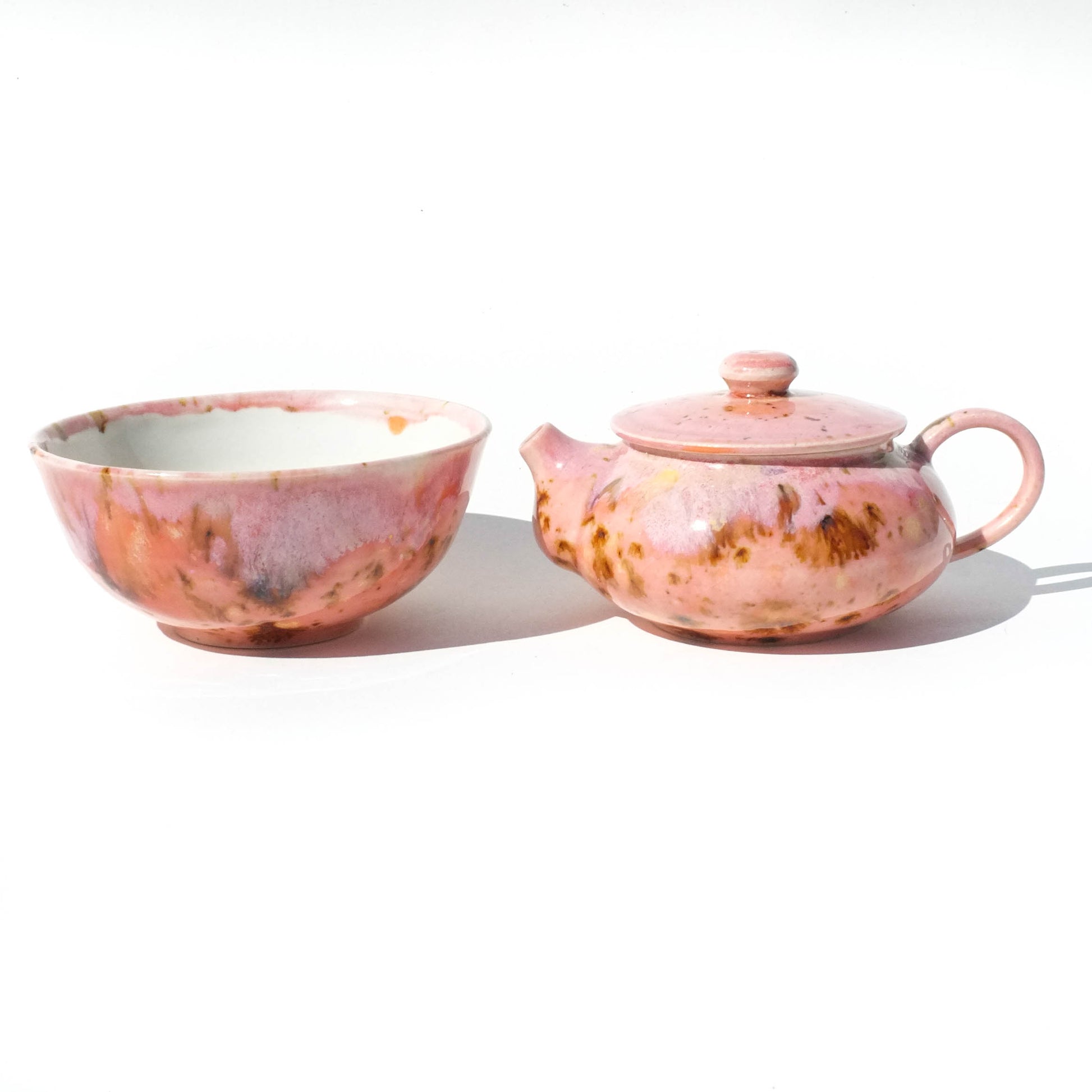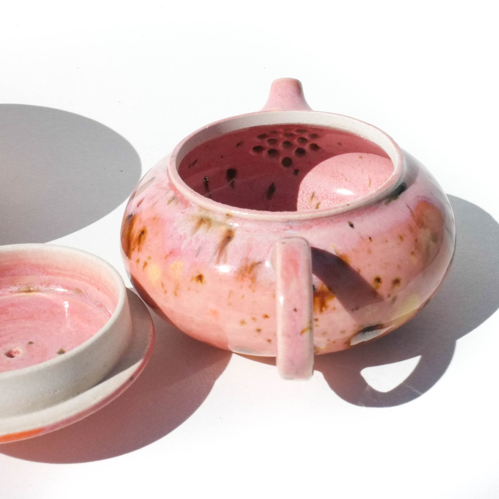 White porcelainous stoneware with pink and coral crackly glaze. The cup is lined with white (it will crackle with use) so you can see the color of your tea! This pot has a wide mouth which is excellent for brewing large-leaf teas, or just checking in on your leaves as the session progresses.